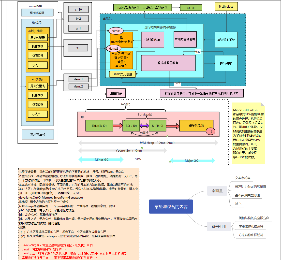 - Jdk1.8: 无永久代,运行时常量池在元空间,字符串常量池里依然在堆里